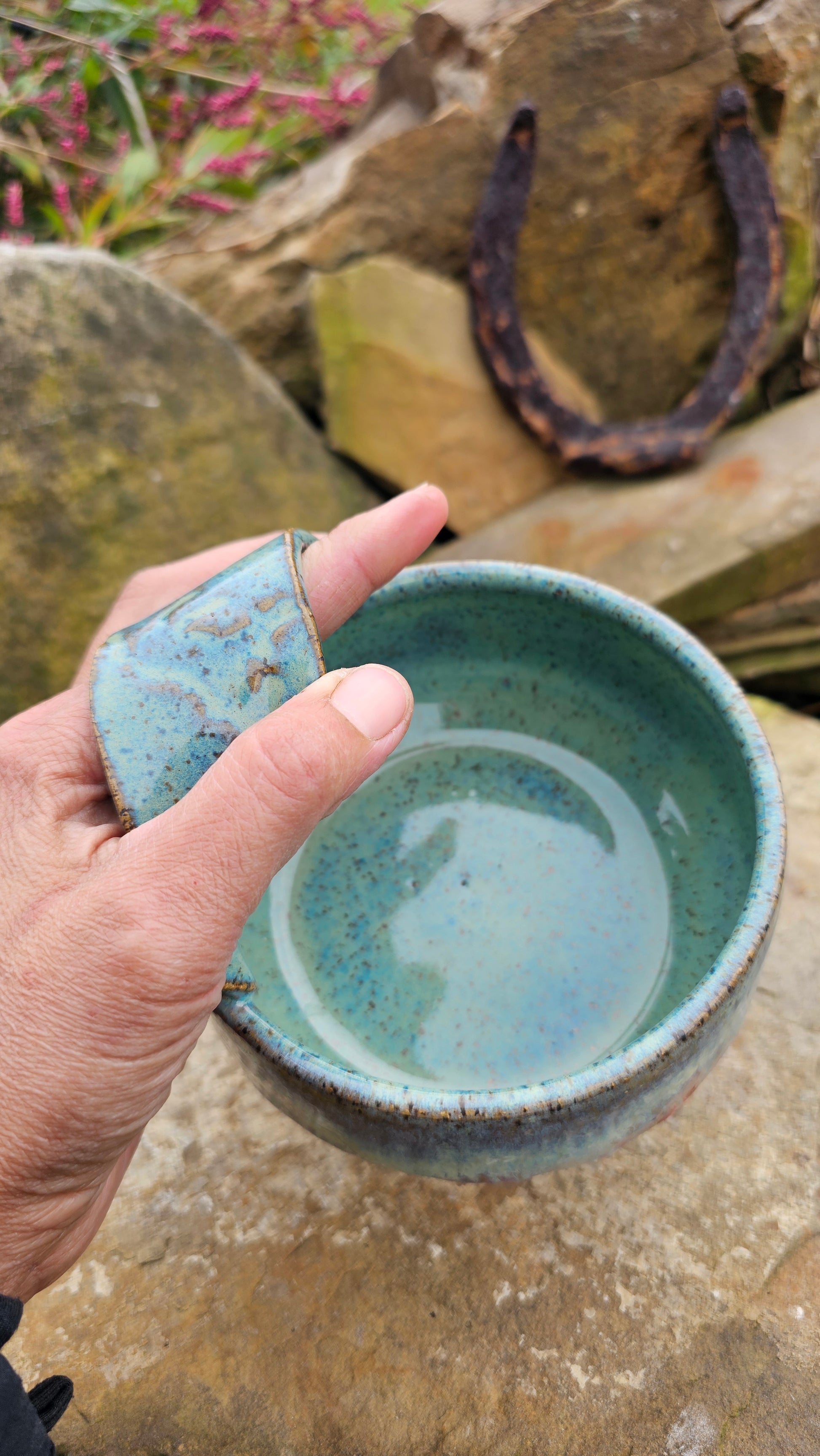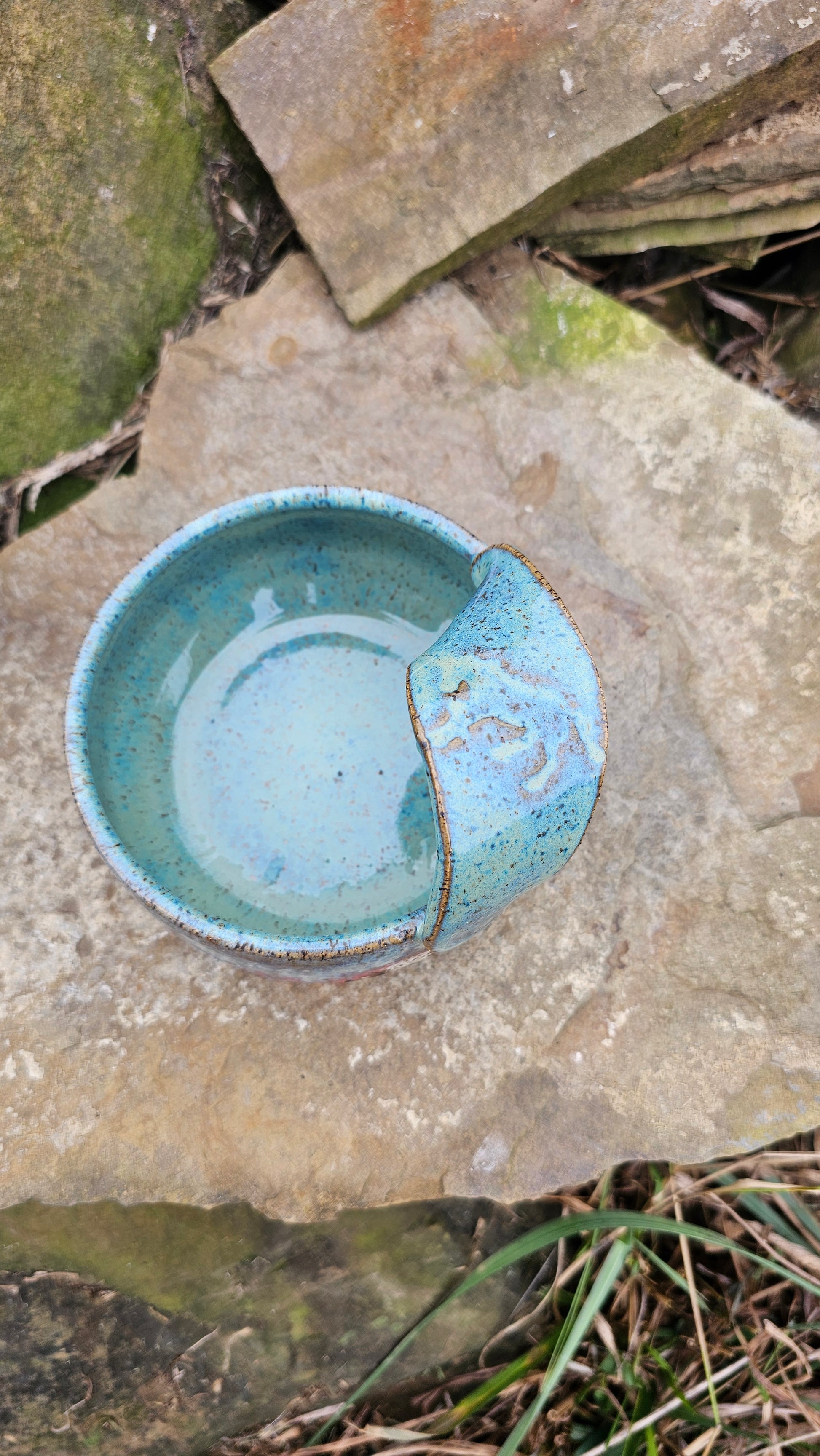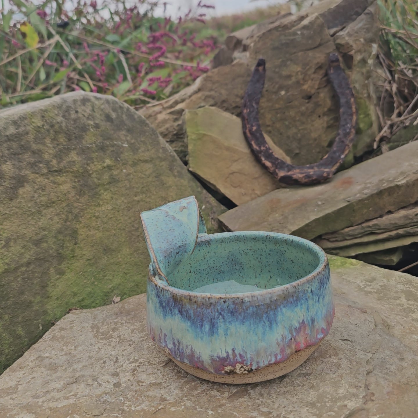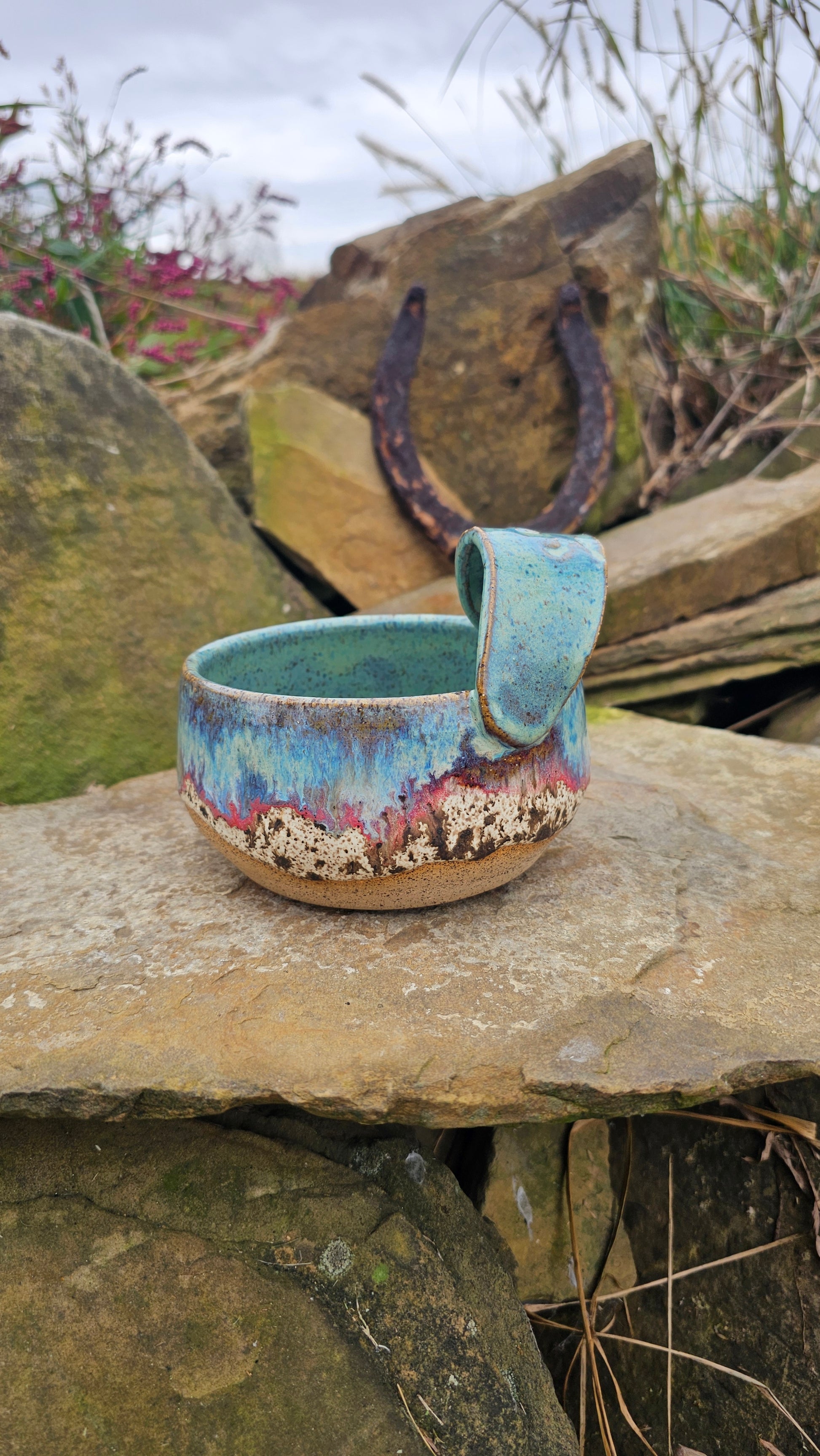 18 oz. handmade pottery soup/chowder/chili bowl that measures approximately 2.5 inches tall x 4.5 inches wide. The inside of this bowl is turquoise and the specks from the stoneware speckled tan clay show through the glaze. The outside of this bowl is multicolored with turquoise, pink, creamy beige with brown specks. The handle is twisted which allows for your left index finger or thumb to slide through for a good grip so you can use your right hand to eat with. The handle is approximately 1.5 inches wide and has a horse imprint stamped on it. Food safe, non-toxic glazes are used. Microwave safe and dishwasher safe although handwashing is recommended for optimal preservation.
